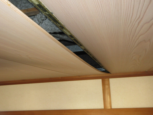 天井板と下地の間に隙間ができており、一部が浮いている状態でした。 |