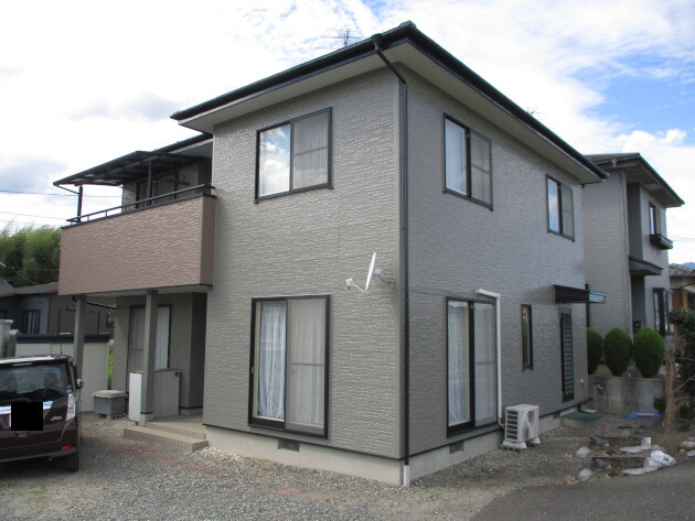 施工前はグレー一色でしたが、今回は2トーンカラーで塗り分けを行い、1階部分をブラウン系で引き締めたデザインにしました。 |