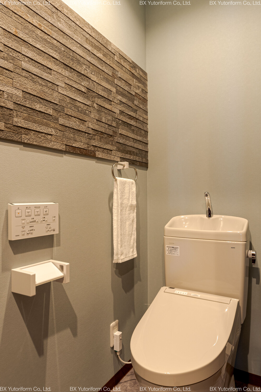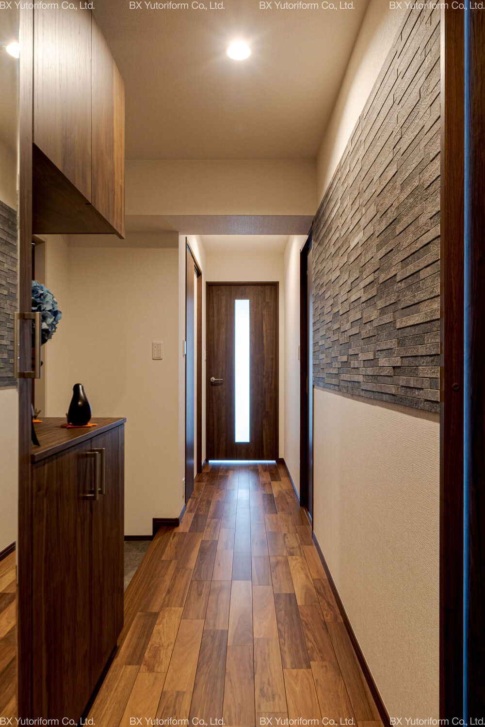 玄関ドアを開けた正面にはエコカラットを取り入れることで、電気などのエネルギーを使わずに調質や脱臭ができ、環境にもやさしく、またアクセントとして重厚感のあるシックな雰囲気へと仕上がりました。