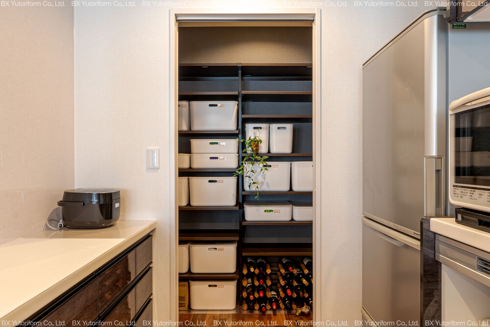 今後過ごしていく中で生活の変化にも対応できるよう、キッチンのカップボード以外に食糧庫として使用が可能な、大きめのパントリーもキッチンに隣接した場所へ計画しました。