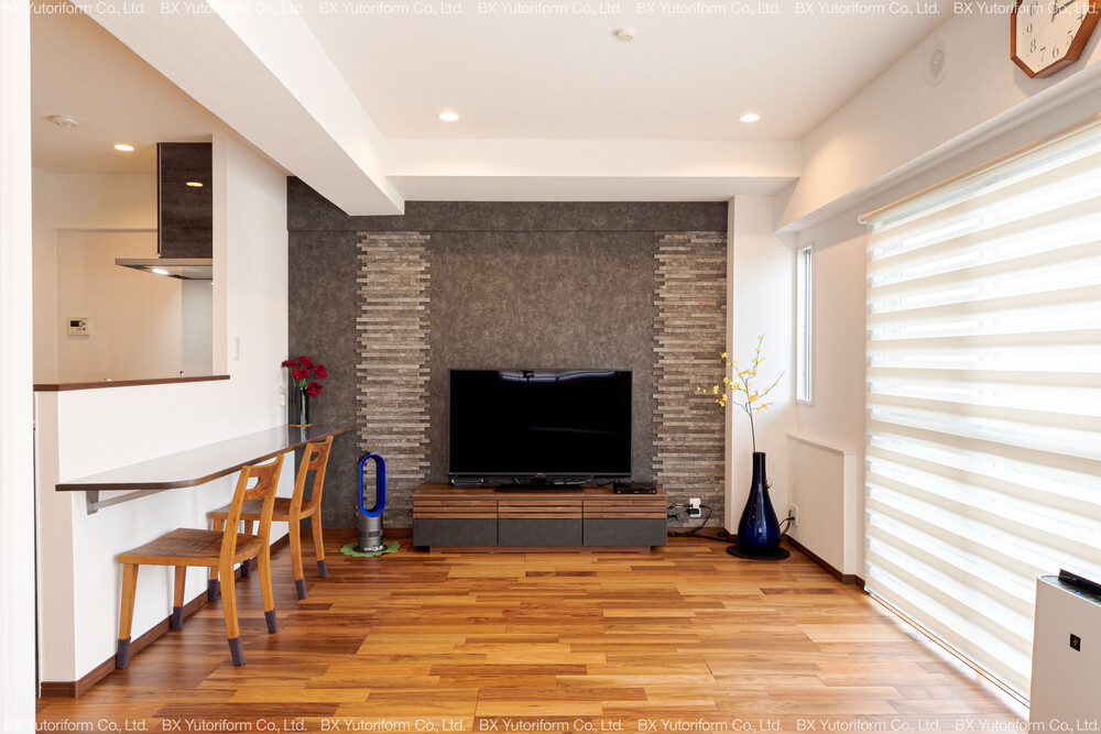 壁に囲われていたキッチンは自然光が差し込む、明るく開放的なオープンキッチンになりました。両親が住んでいた時から使用していた親戚が作った大切な椅子は、食事やテレワークで使用できるよう、キッチン背面にオーダーサイズのカウンターを設置しました。リビング全体も明るく快適な空間へ仕上がりました。