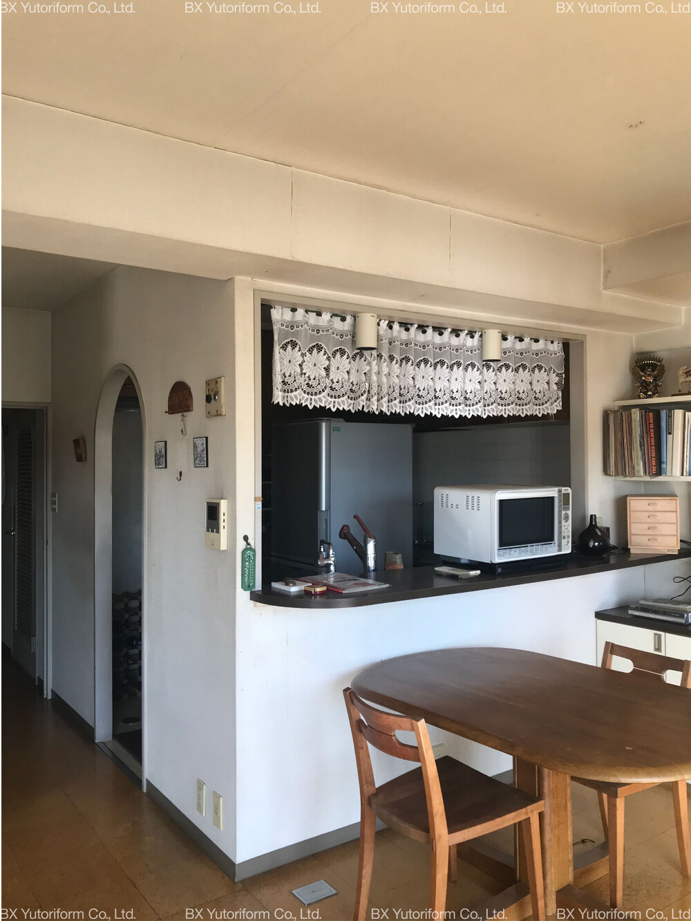 以前のキッチンは壁に囲われ、対面キッチンではあるもののリビングに面した開口部は梁下についた吊戸棚によって少々小さく、日の当たらない、薄暗い雰囲気でした。