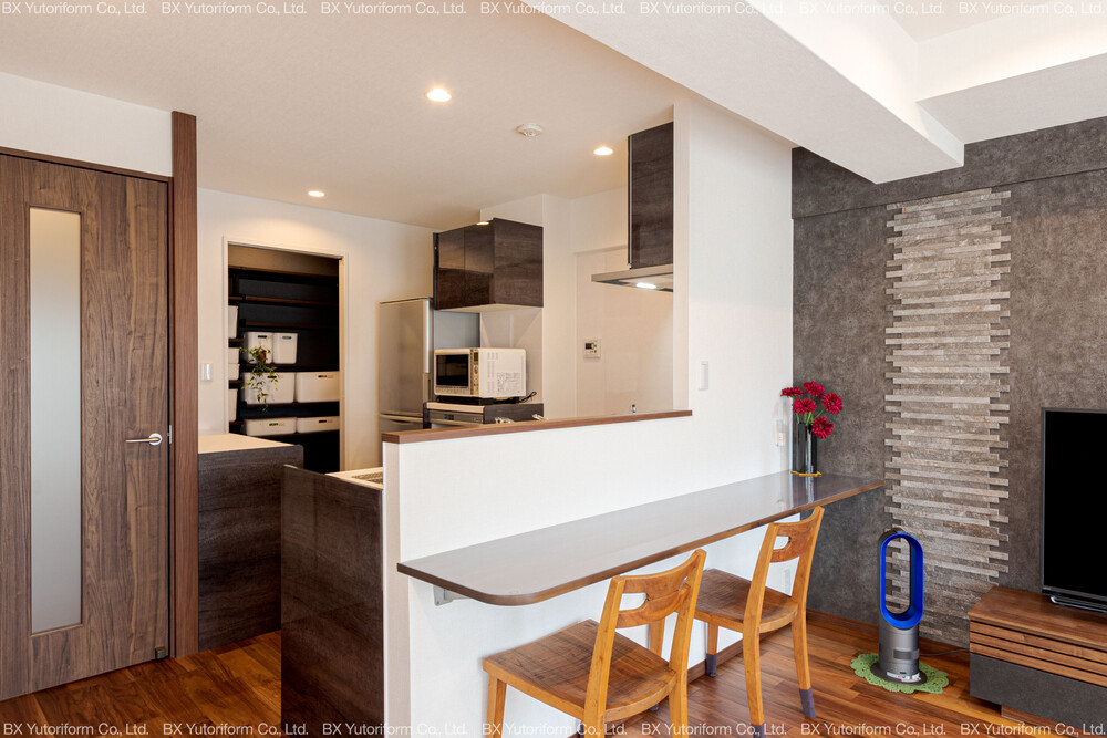 改修前から使っていたご親族様からプレゼントされた大切な手作りの椅子は、食事やテレワークでも使用ができるよう、キッチン背面にオーダーサイズのカウンターを設置しました。