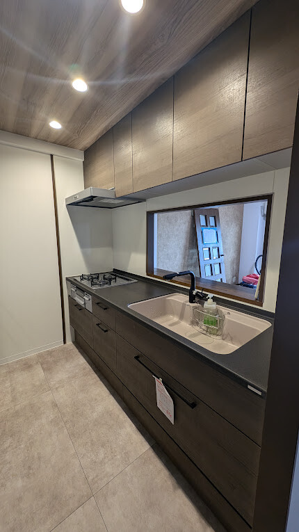 落ち着いた雰囲気のキッチンは、吊戸棚、天井、床の色を薄くすることで、お気に入りキッチンがより引き立ちます。