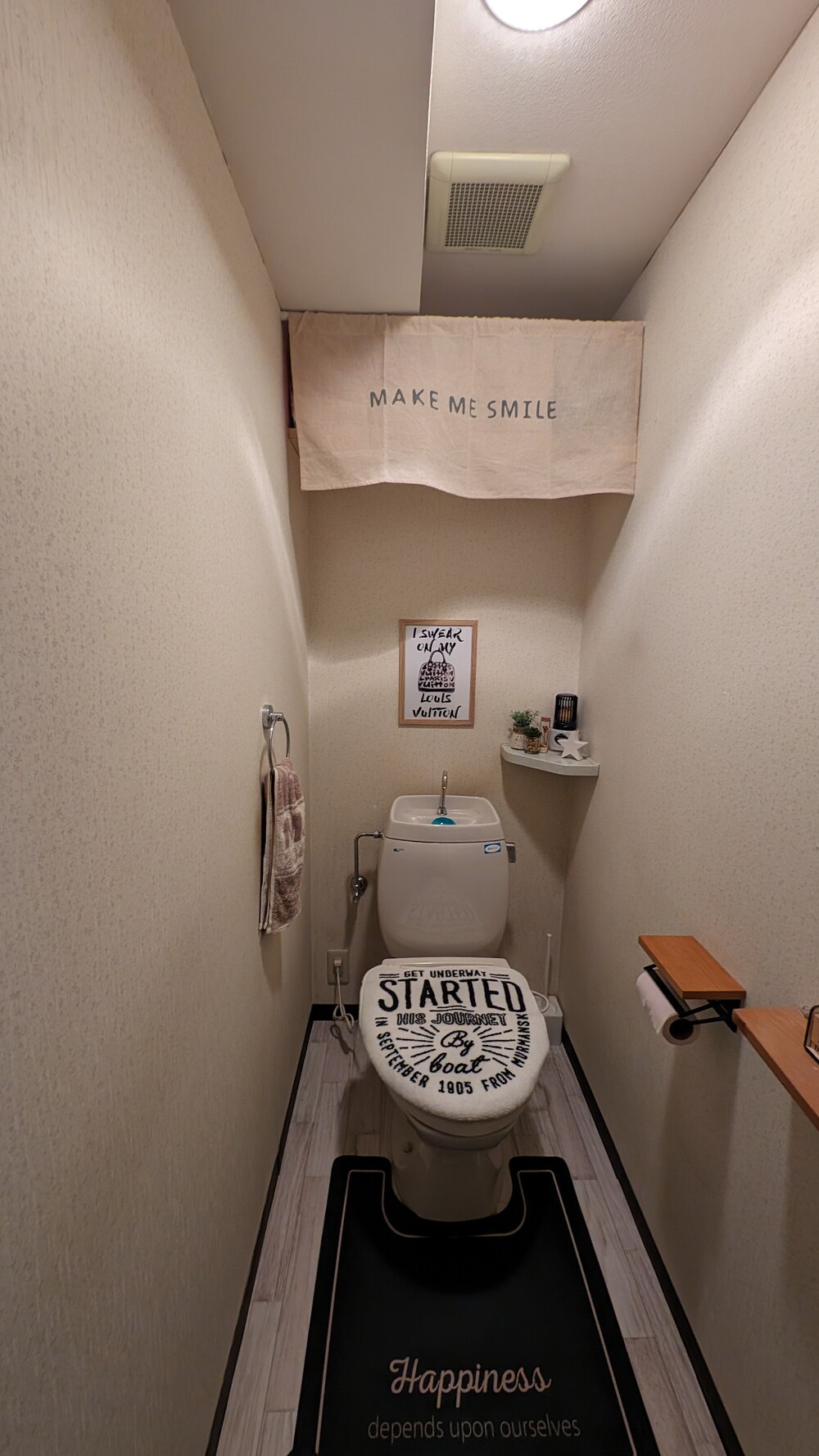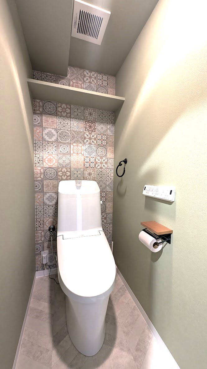 トイレ空間は遊び心のあるクロスを採用。ペーパーホルダーやタオル掛けも好きなものを取り入れ、お気に入りの空間に。