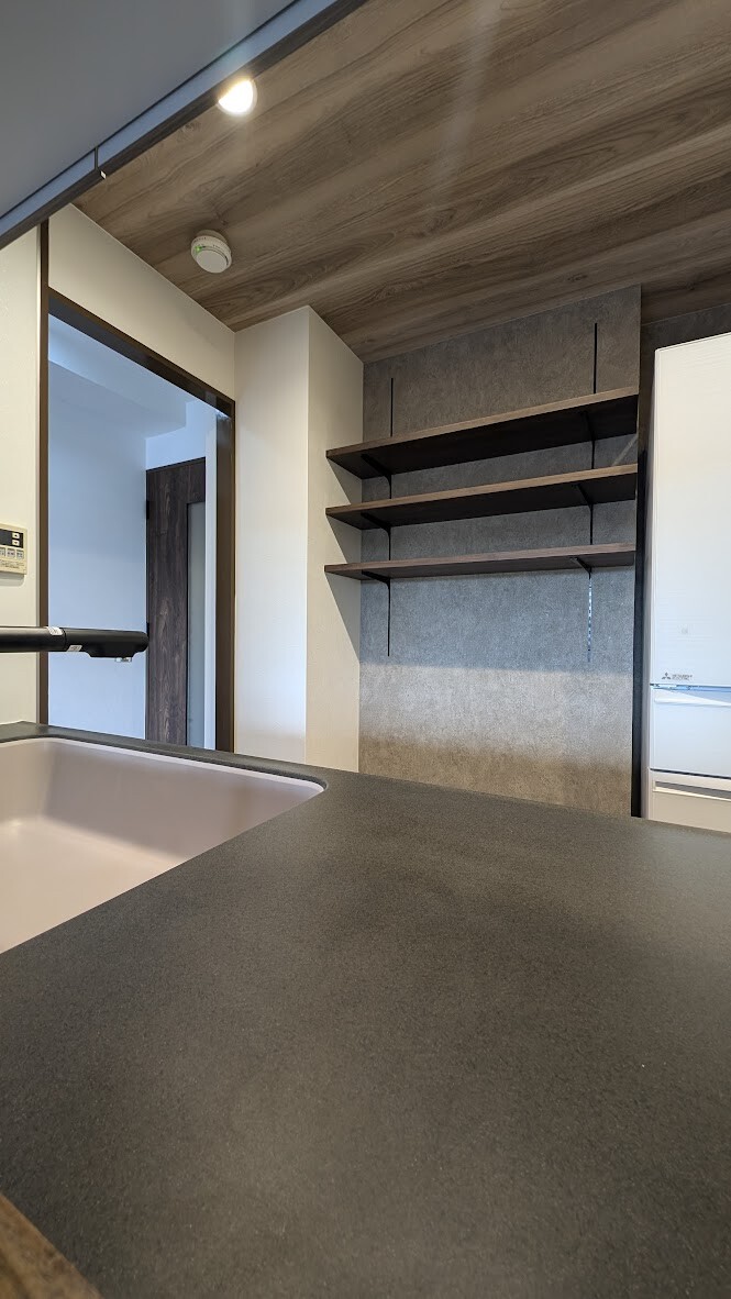 キッチンの後ろには、アクセントカラーとなるクロスにシンプルな可動棚を採用。おしゃれでスッキリ収納を実現しました。