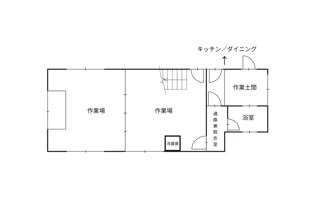 旧浴室を解体して作業土間と一体化し、浴室・脱衣室・作業の動線を分離。