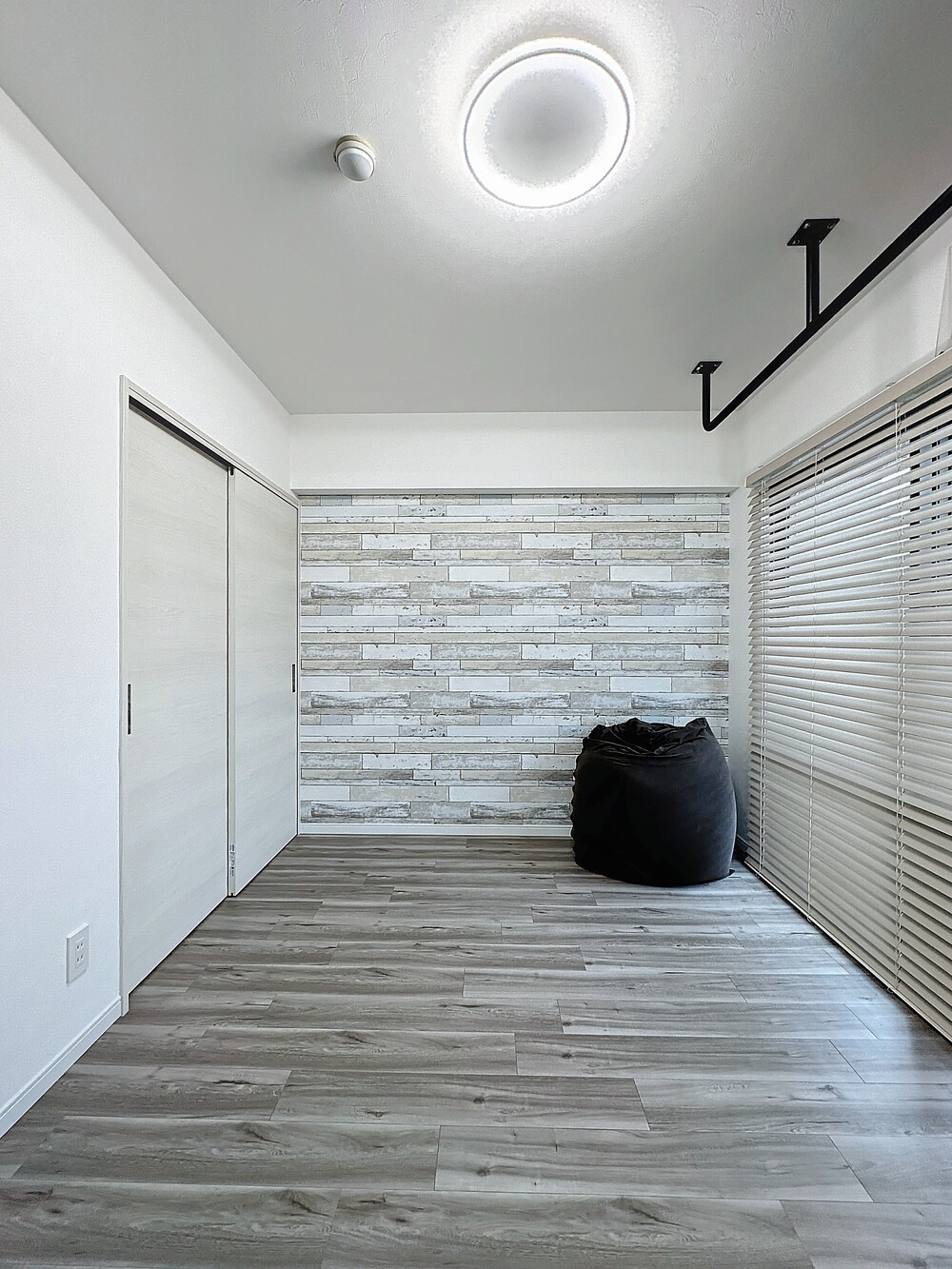 床を淡いグレーのフローリングで統一。優しい色合いにブラックを効かせたコーディネートです。
