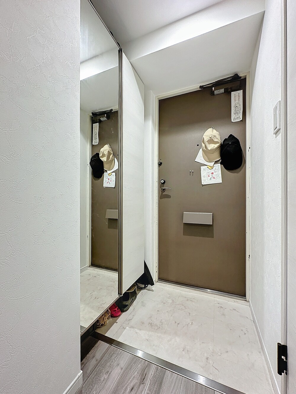 玄関まわりに大きな鏡の付いた収納棚を設置。収納下の空間にも普段使いの靴を収納でき、たたきが広く使えます。