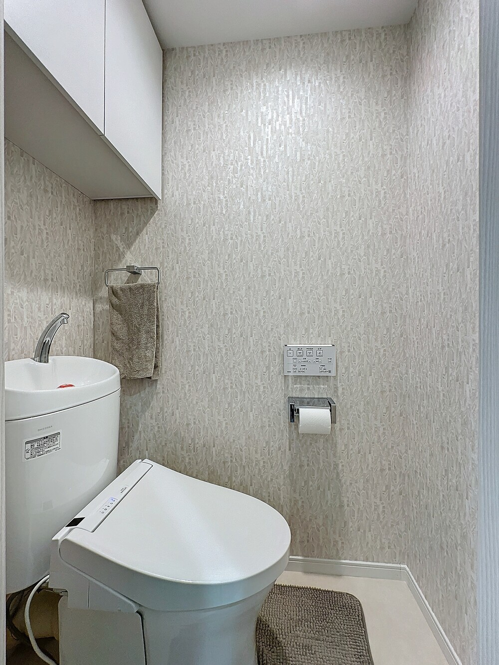トイレのクロスは淡いグレーのモザイク柄で、落ち着く空間に。