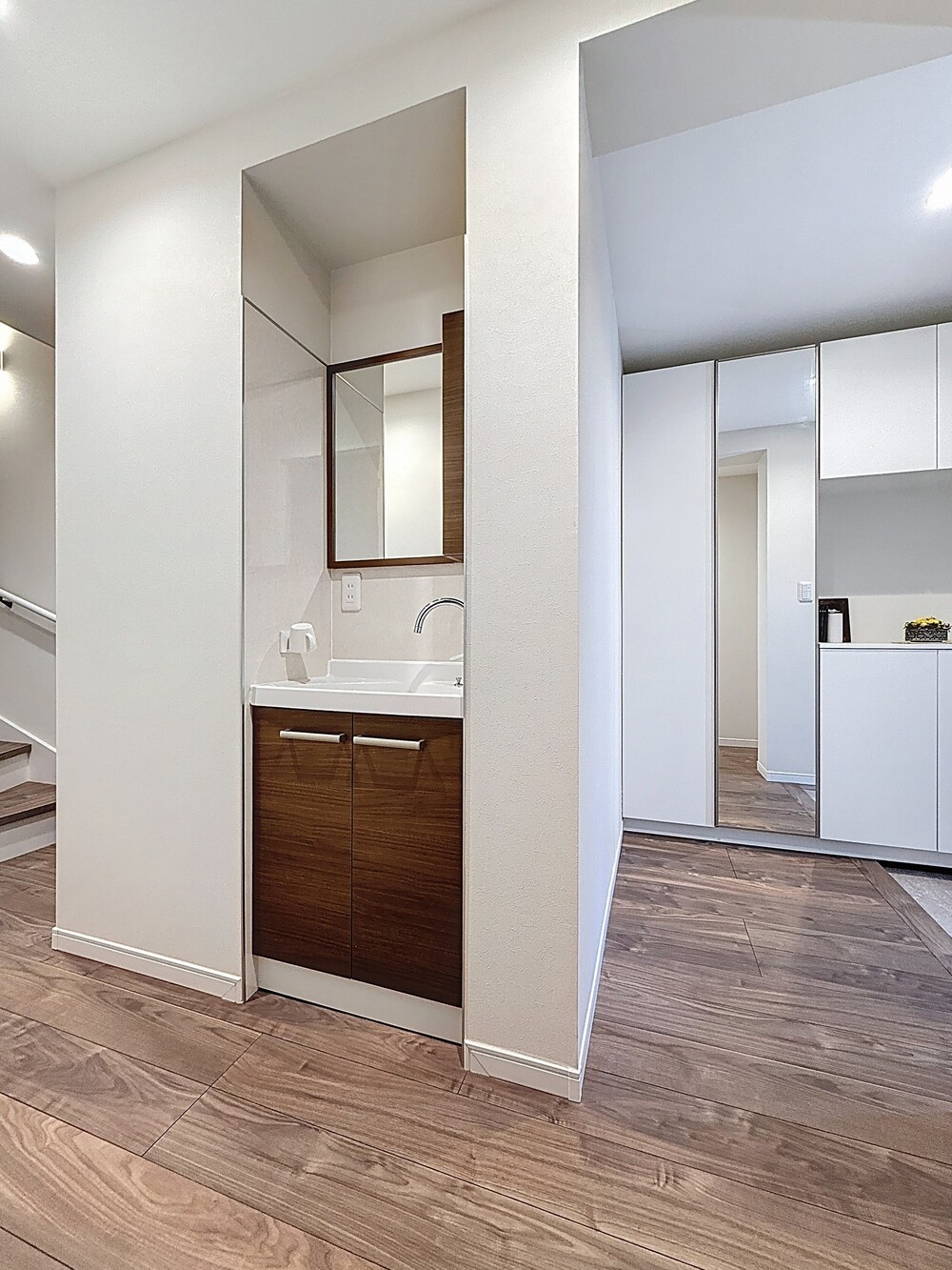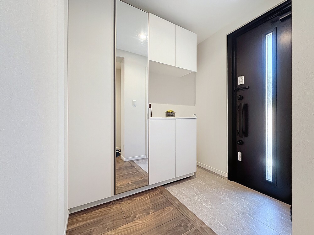大容量の玄関収納と大きなミラーを設置。