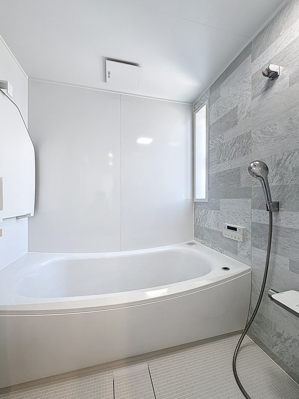 浴室も清潔感を重視し、シンプルなホワイトベースで統一。アクセントに石目調のパネルを入れました。「汚れが目立つことですぐお掃除できます。この方が清潔感が保てて良い」とN様。