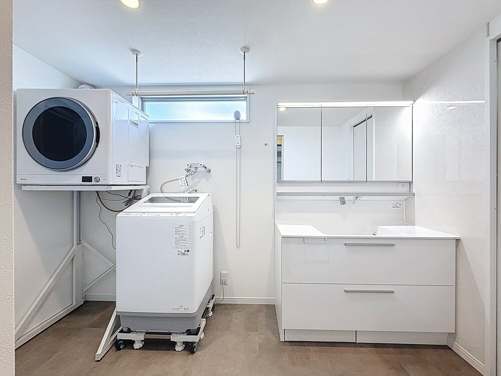 シンプルでスタイリッシュな洗面台。ボウル一体型のカウンターでお手入れラクラクです。さらに洗濯機にキャスターを設置し、乾燥機の下へ移動できるようにしたことで、お掃除しやすく、スペースの有効活用もできました。
