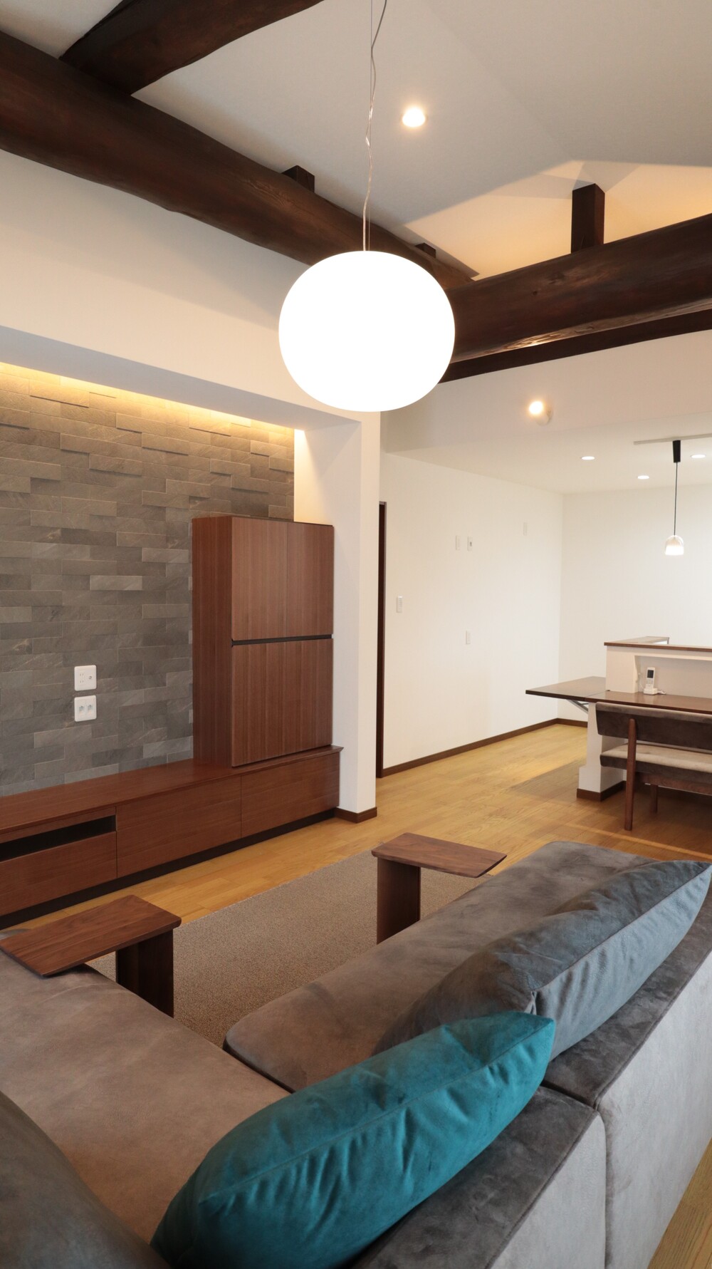 新築したかのようにキレイになりとても満足されていました。既存の床や壁材にトーンを合わせたため、既築と改築部分の違和感がないです。何よりも急遽設計変更をお願いした2階のリビングでは梁が強調されながらも空間と調和しておりオシャレな空間になりました。
