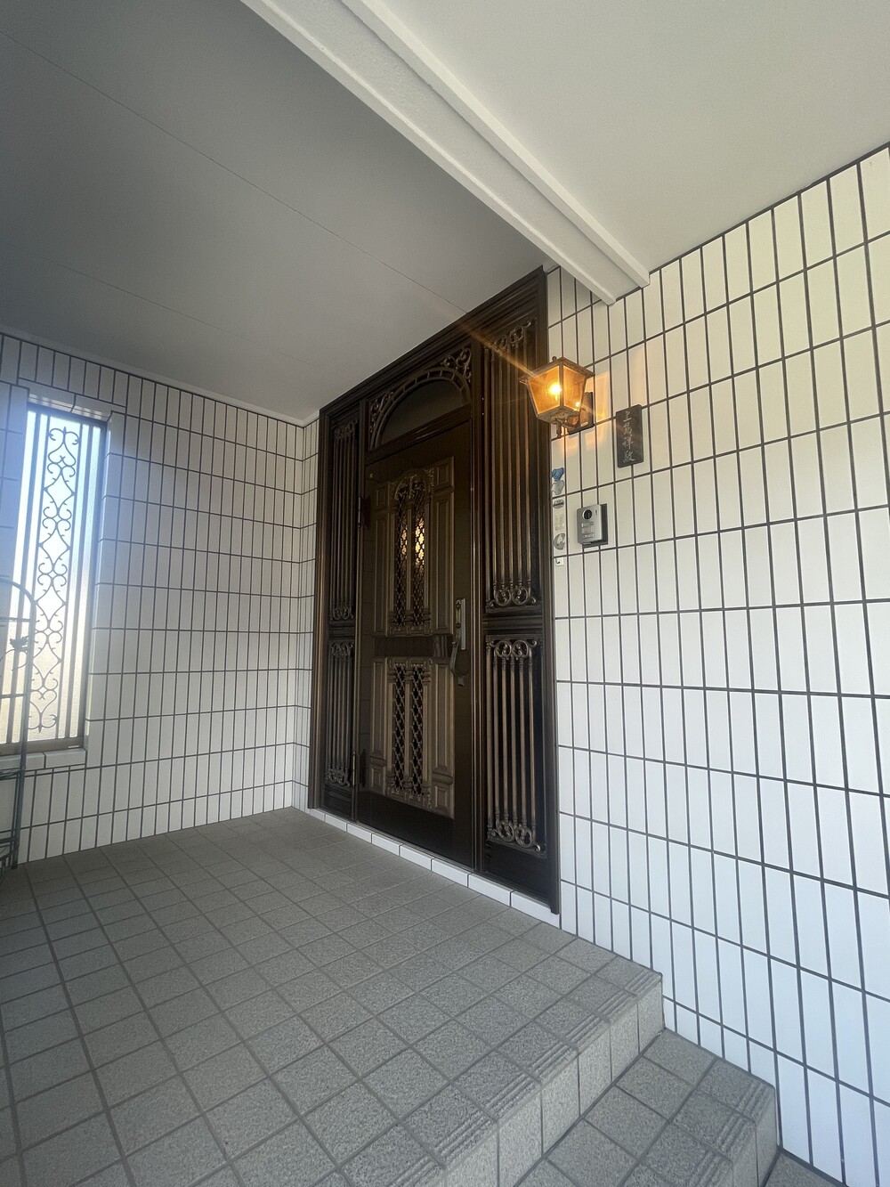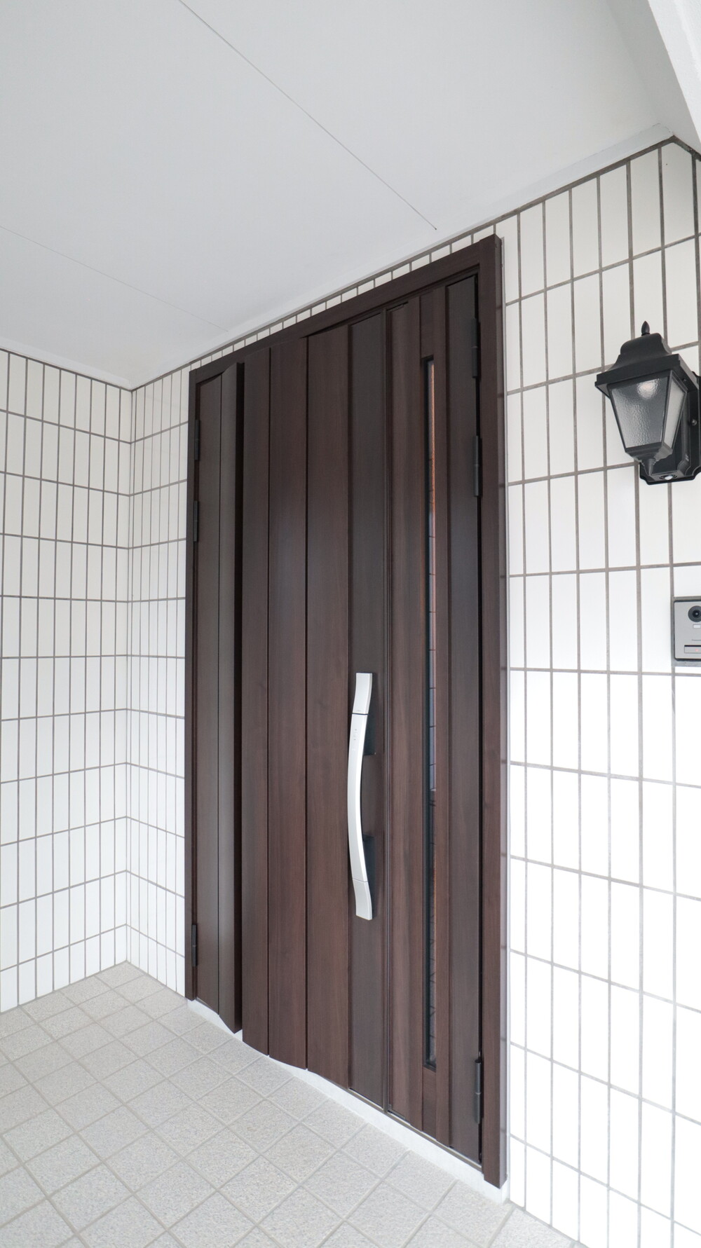 TOSTEMグランデル2。玄関錠の劣化により玄関扉ごと交換しました。電池交換を不要にするためにインターフォンから分岐して電源式としました。