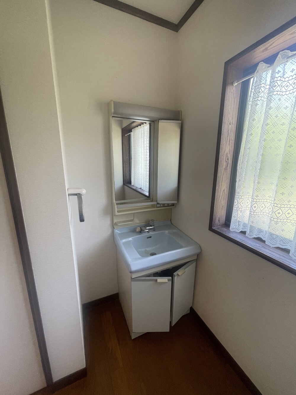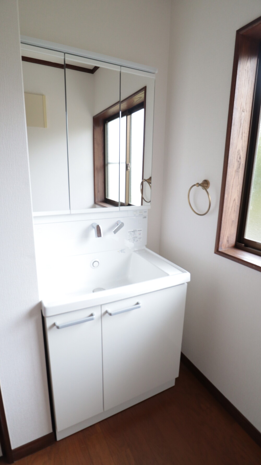 TOTOサクア。幅600→750に広げ、洗面雑貨の収納量を確保するために三面鏡にしました。掃除しやすいよう陶器ボウルにしています。