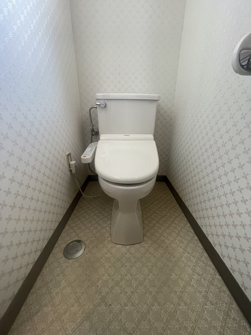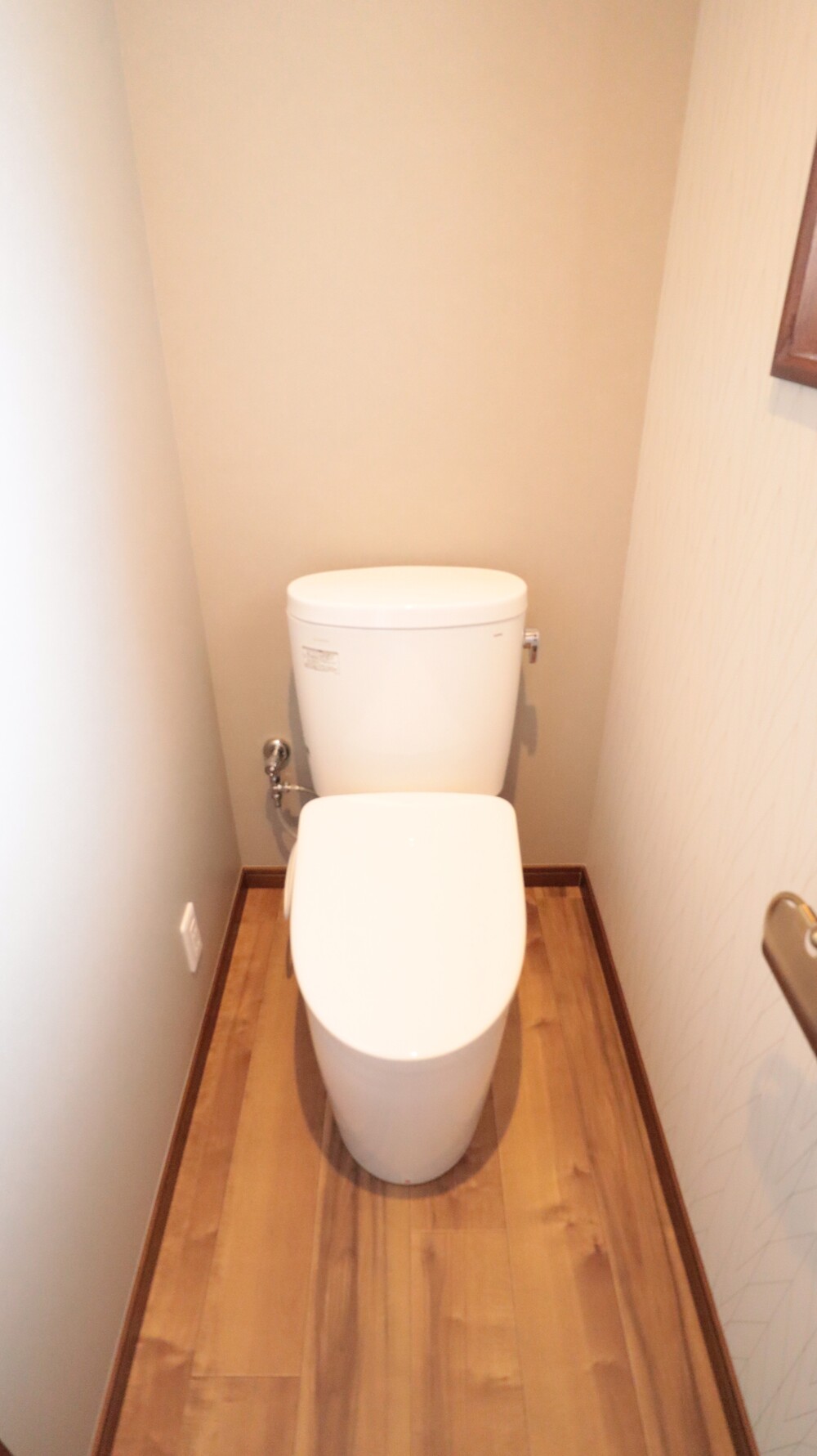 TOTOピュアレストEX。1階トイレと同じく段差をなくしクッションフロアとアクセントパネルで若年世帯向きのデザインにしました。