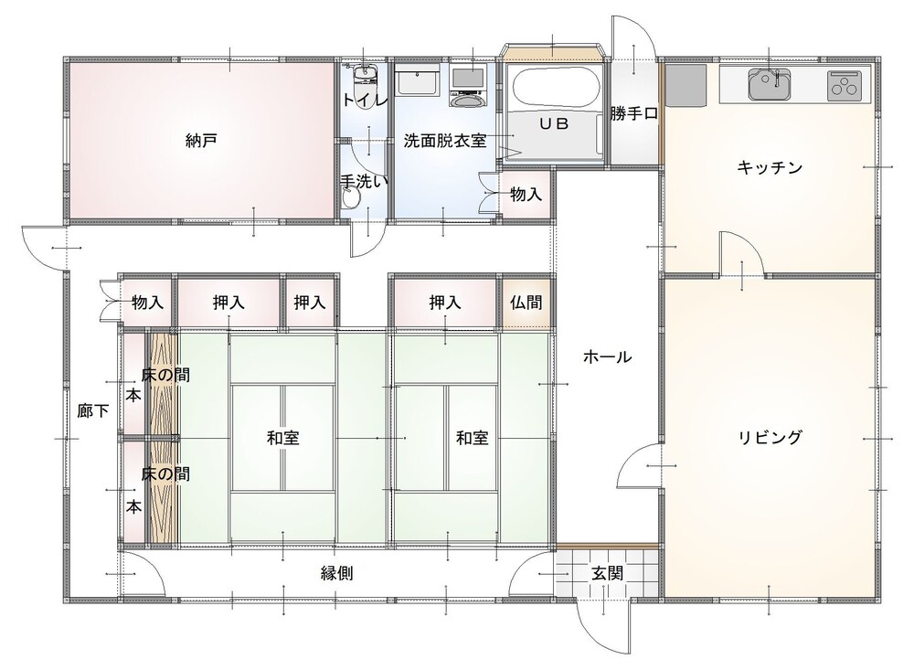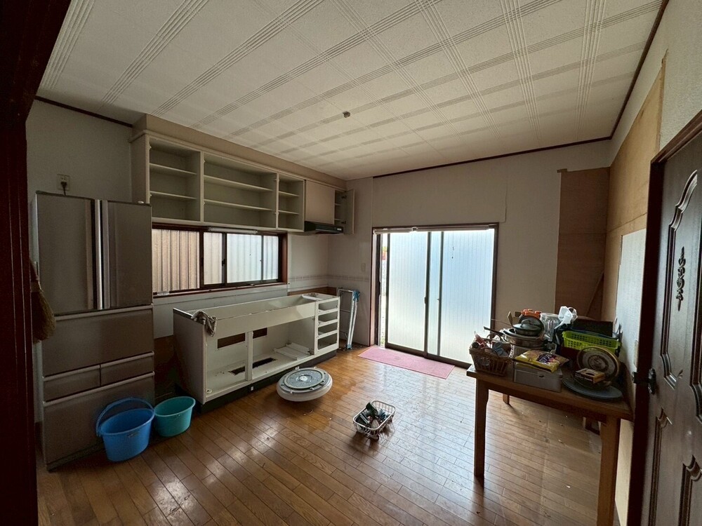 ①区切られていたキッチン・リビングを一部屋のLDKに。急な来客時にも対応できるよう間仕切りドアを設置しました。②使われていなかった勝手口スペースをパントリーに、大きな窓は縦長窓を分散して配置しました。③2分割されていたトイレを1つの空間にして広さと使いやすさを叶えました。④廊下や縁側も部屋部分に取り込み広さと収納を確保しました。⑤洗面脱衣室・浴室ともに窓を小さくして断熱性と防犯面の安全を確保しました。⑥玄関を広げ収納を設置、ホール突き当りのデッドスペースを収納化しました。