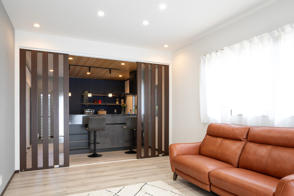 キッチンと白をメインとした柔らかな明るいリビングとのメリハリが感じられます。