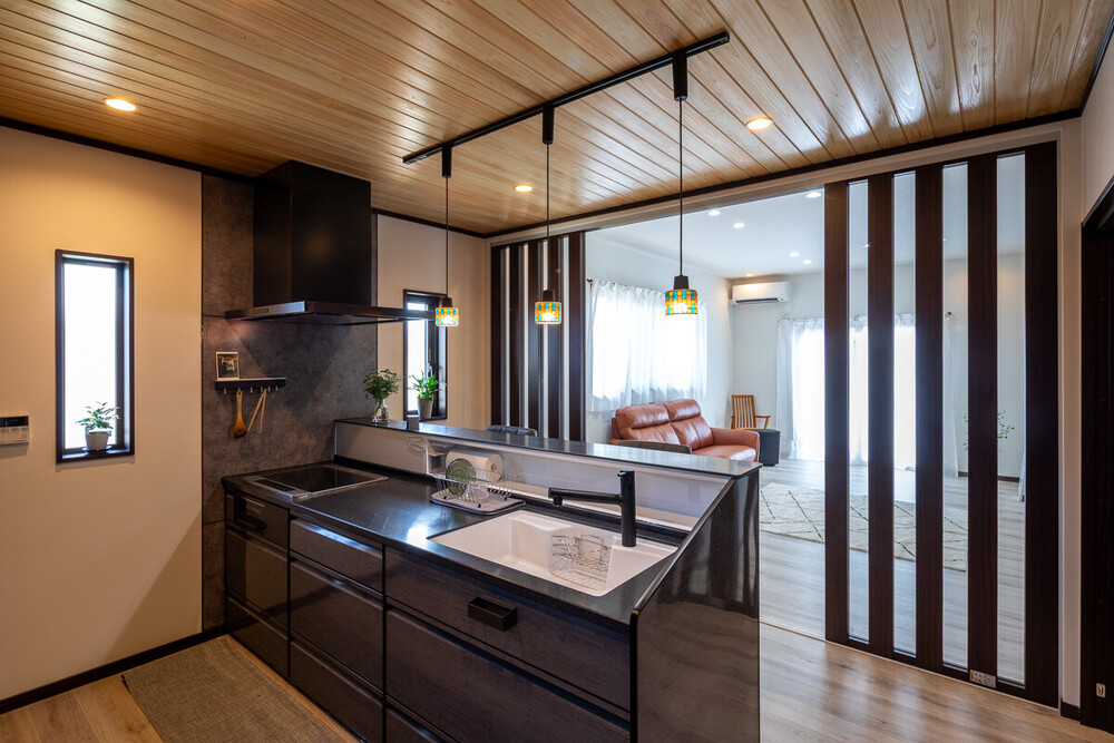 お客様お気に入りのキッチンからの眺め。キッチンのペンダントライトも空間に馴染んでいます。