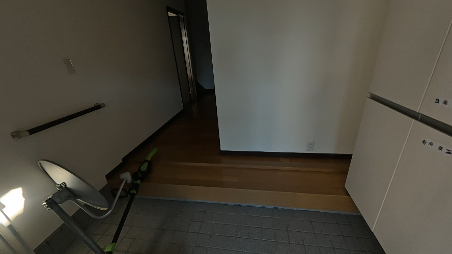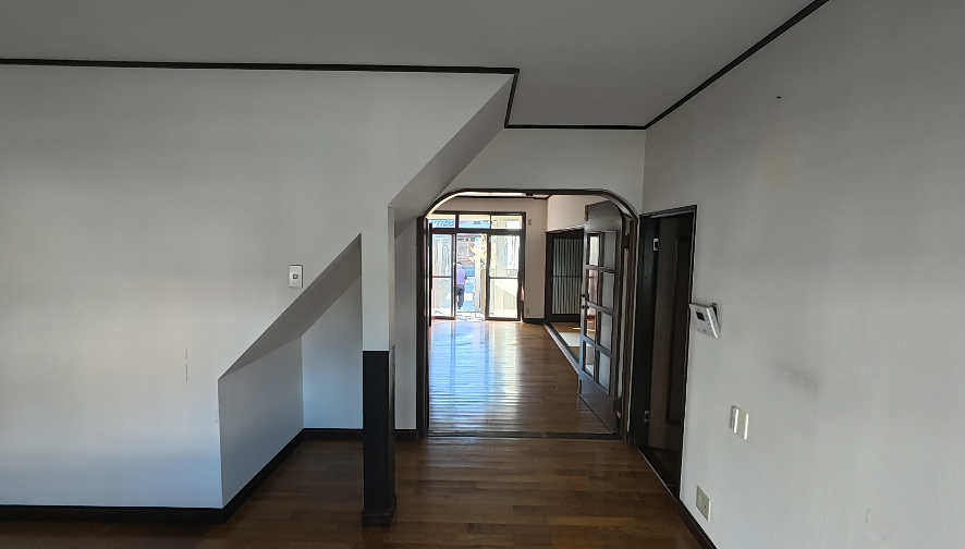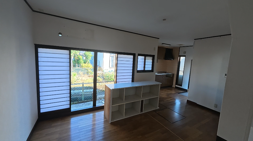 既存のLDK空間には、リビングとダイニングキッチンを分断する様に階段がありました。このお陰で南面の日射取得が北側ダイニングキッチンに届く事はなく、空調効率も悪く冬場は寒い空間となっておりました。そんな階段を移動させワンフロアで広々利用できるLDK空間へと甦らせました。障子戸を開ければ光も風も分断させない南北に抜けた空間となりました。障子を開ければ土間タイルテラスとしてLDKと一体で利用、障子を閉めれば和室へ来客を直接案内できるホールとしても利用可能。