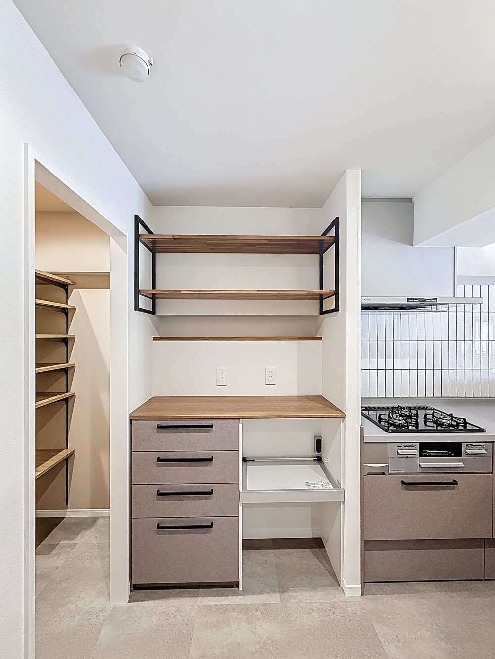 扉と背面の収納扉を同じトーンの木目柄で統一しました。
