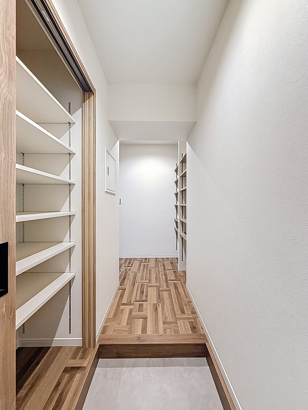 玄関と廊下にも可動棚付きの収納スペースをつくりました。