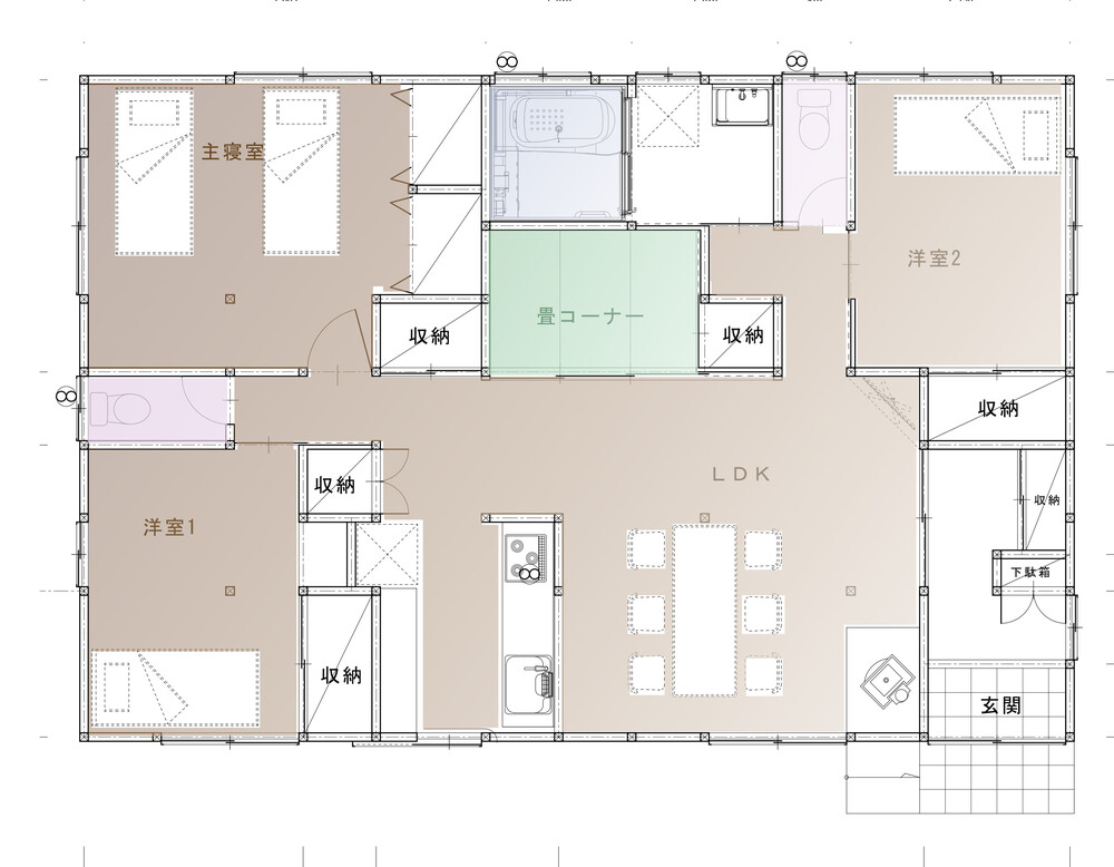 広がりのある店舗空間を活かし、家族が自然と集まるリビングを核に、各居室や水まわりを配置しました。