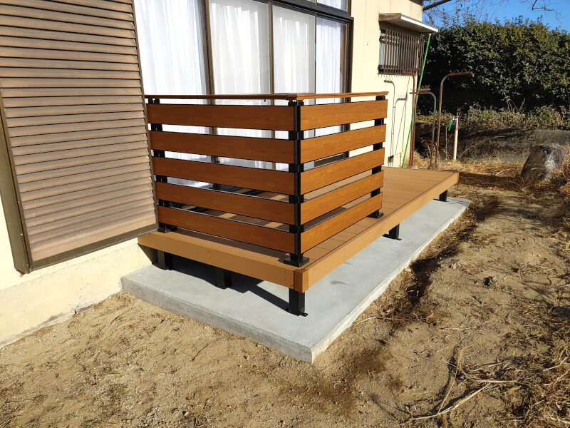 日の当たる南面に、約1300×1500㎜のコンパクトなウッドデッキを新設しました。広い庭に面した位置とし、室内と屋外を緩やかにつなぐ中間的な空間として計画しています。洗濯物を干す実用的な場としてはもちろん、季節の良い時期には腰掛けて過ごすリラックススペースとしても活用可能です。素材にはリウッドデッキを採用し、木の風合いを感じながらも耐久性とメンテナンス性に配慮しました。