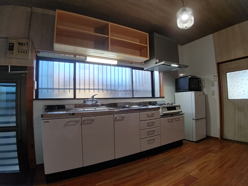 既存の雰囲気を大切にしながら、レトロなデザインのブロックキッチンへ入れ替えを行いました。吊戸棚は弊社社員による手作りの造作で、空間に温かみをプラス。天井には木目調クロスを採用し、こだわりのレトロかわいいペンダント照明がやさしく空間を照らします。限られた予算の中で、個性と暮らしやすさを両立したキッチンです。