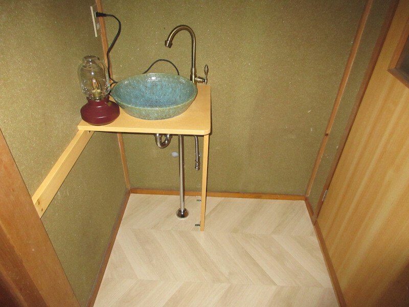 既存の洗面台はサイズが大きく、トイレへの動線をふさいでいたため、使い勝手の改善を目的に改修を行いました。お客様がこだわって選ばれた洗面ボールと蛇口を活かし、弊社社員による手作りの造作洗面台を製作。空間に合わせた寸法とし、動線と使いやすさを確保しています。低予算での計画のため、あえて手作りならではの素朴な表情を残した仕上がりとしました。床にはヘリボーン調のクッションフロアを採用し、さりげないデザイン性をプラスしました。