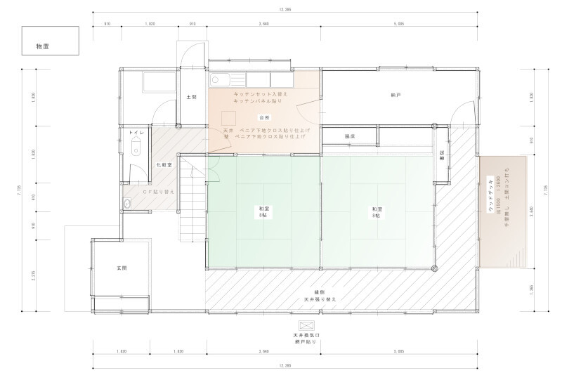 限られた予算の中で、動線や寸法を見直し、日常で支障のあった部分を重点的に改修。キッチンや洗面は造作を取り入れ、空間に合わせた無理のない計画としています。また、南面には庭とつながるウッドデッキを設け、室内外の使い方に幅を持たせました。図面と合わせて、部分的な改修でも住まい全体の快適性を高められることを示したリフォーム事例です。