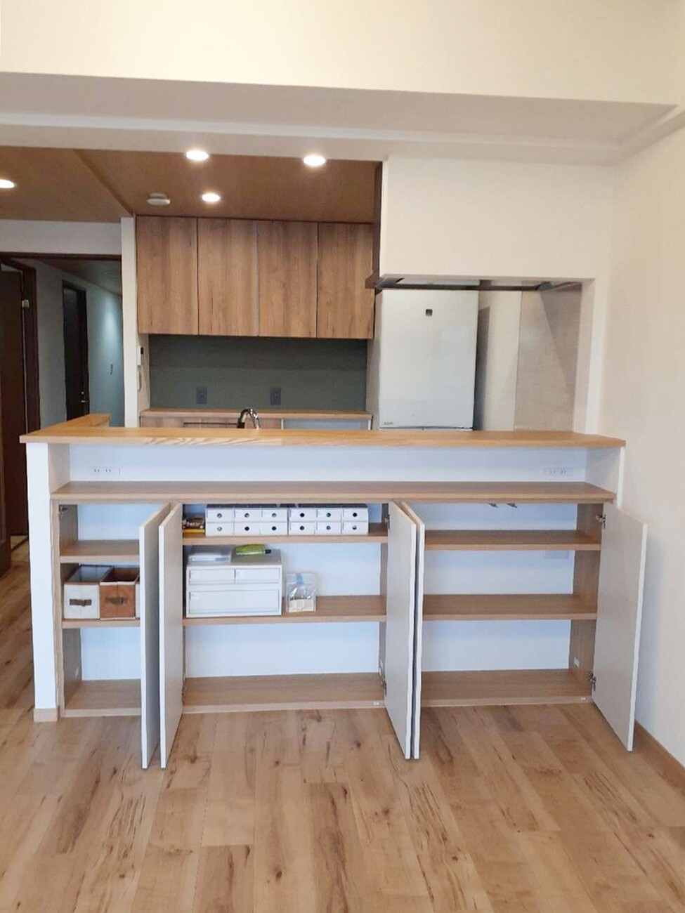 ・キッチンカウンター下に飾り棚+奥行30㎝くらいの収納を設置