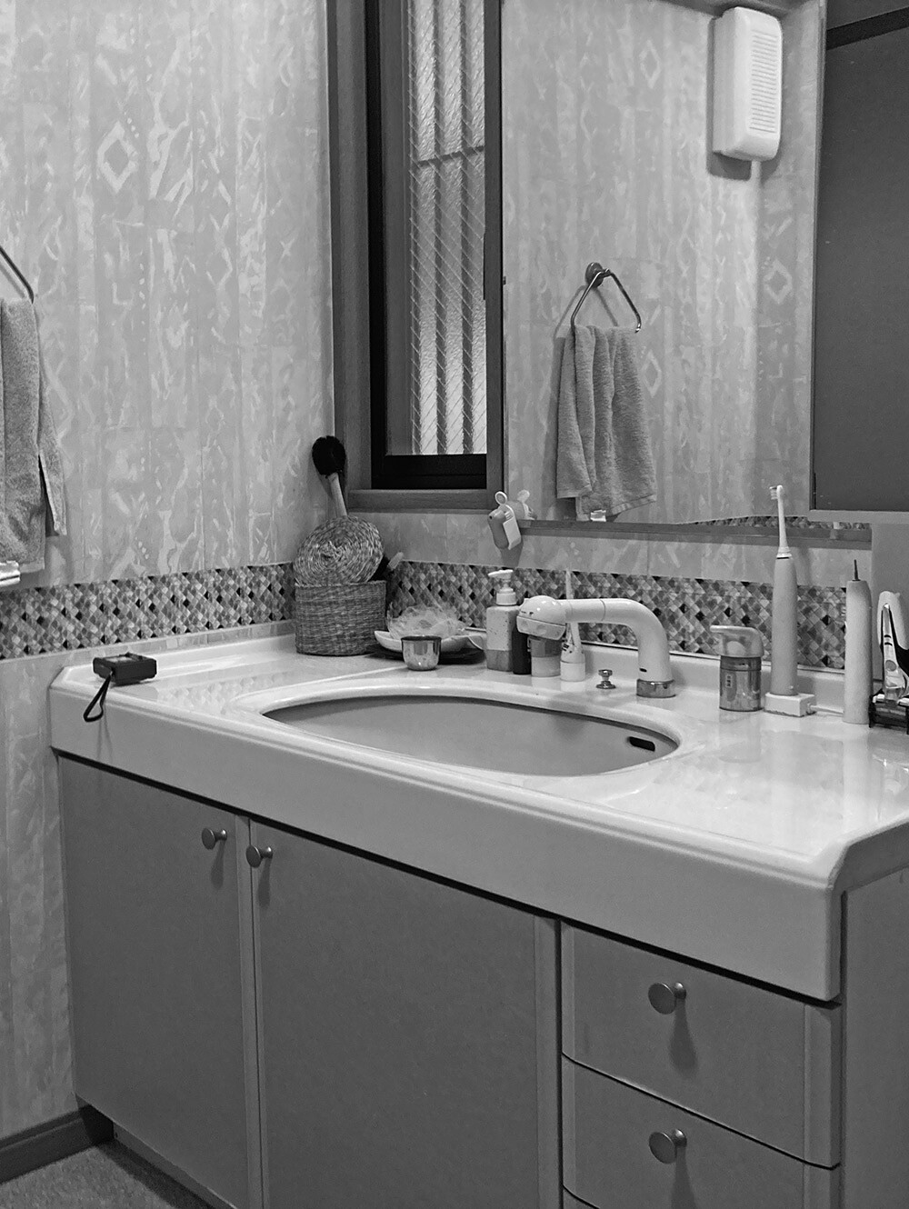 以前見た当社のリフォーム実例「青い造作洗面台」に憧れ、築23年の戸建て洗面室をオーダーメイドで一新。