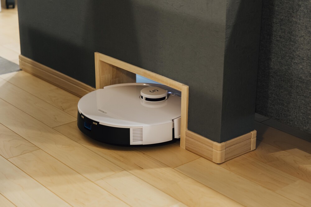 構造上残る柱を活かしてデザインウォールを計画。現在は飾り棚として使用し、将来は猫と暮らすためのキャットウォークへ発展できる設えとした。ソファ下には開口を設け、お掃除ロボットと猫が自由に行き来できる機能性も備えた。