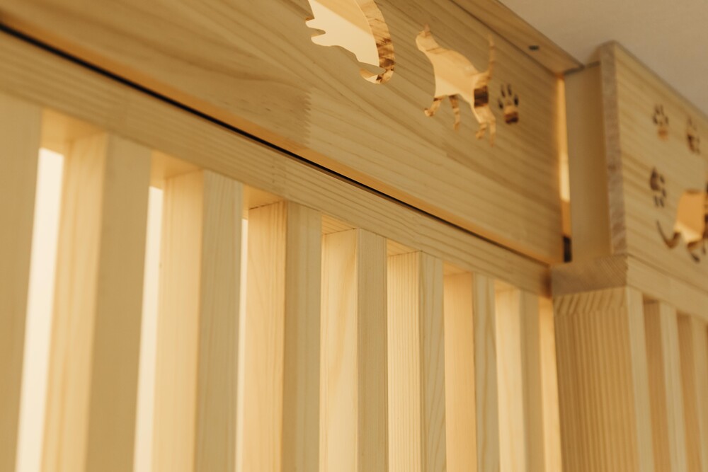 完成後、お施主様がガレージでDIY製作した猫モチーフの建具を設置。遊び心のある意匠が空間に個性を与え、住まいへの愛着を深めている。