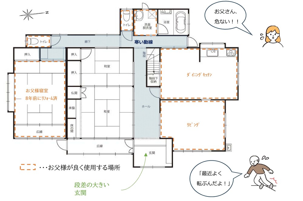 大人になると生活リズムや価値観が確立され、親子であっても同居には迷いが生まれます。お父様は一人暮らしに不安を抱え、娘さんも将来の同居を考えながら、生活リズムの違いや寒さ・段差の多い実家での暮らしに不安を感じていました。その“心の壁”を取り除き、安心して共に暮らせる住まいへ再生しました。