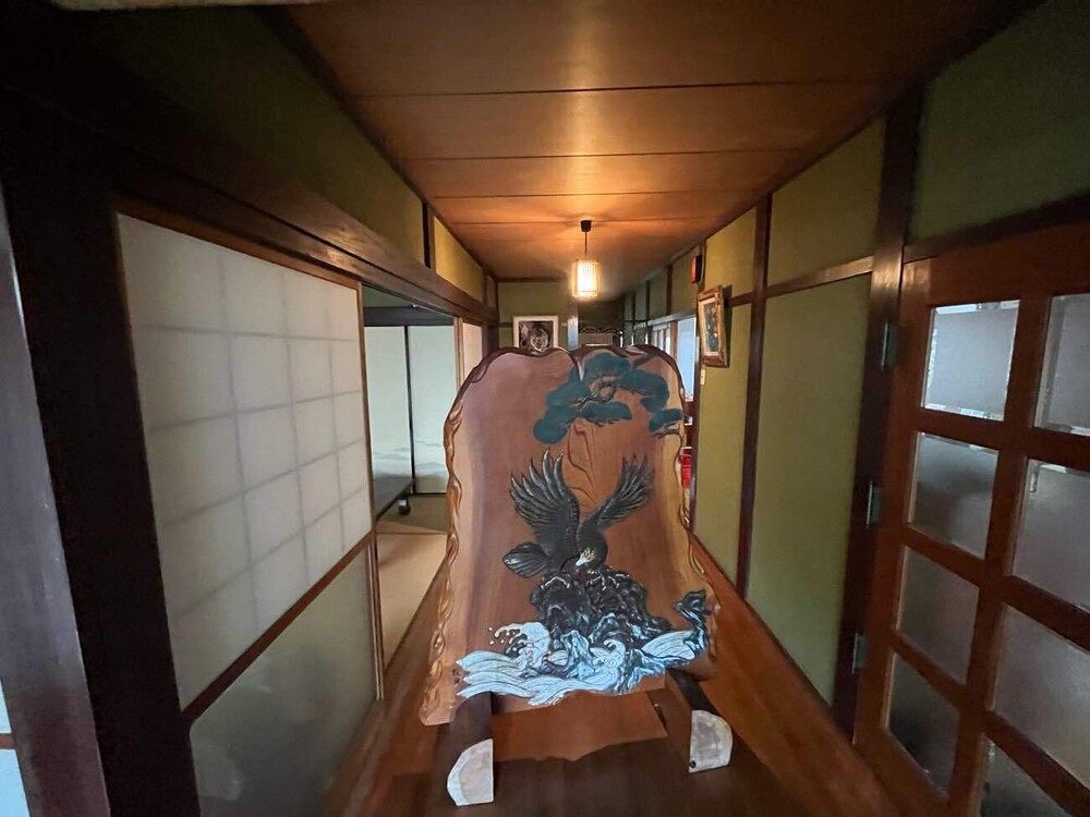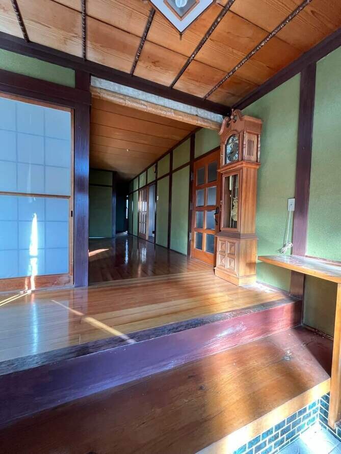 赤茶の壁が印象的な母屋の玄関。既存は大きな段差とシロアリ被害があり、安全面に課題があった。段数を増やした回り階段で段差を解消し、誰もが上がりやすい動線へ改善。お子様の靴の着脱や玄関先での会話が自然に生まれる、家族を迎える空間となった。