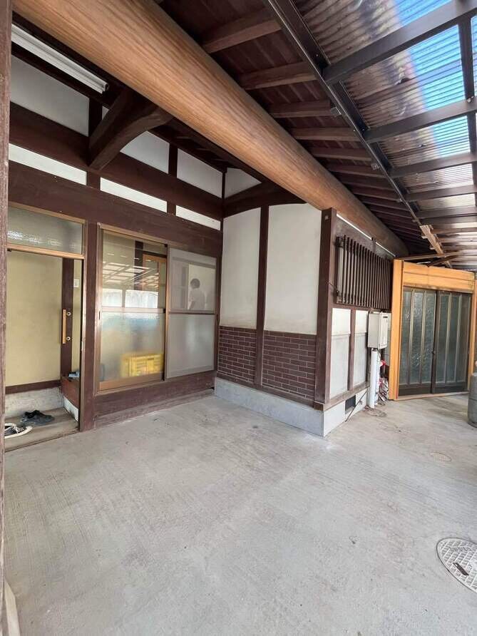 大工だったお父様が手がけた離れには立派な虹梁が残されていた。玄関のない建物を子世帯の住まいとして再生し、虹梁を活かしたコンパクトで機能的な玄関を新設。職人技で納めた玄関ドアとともに、記憶を継承する象徴的な空間となった。