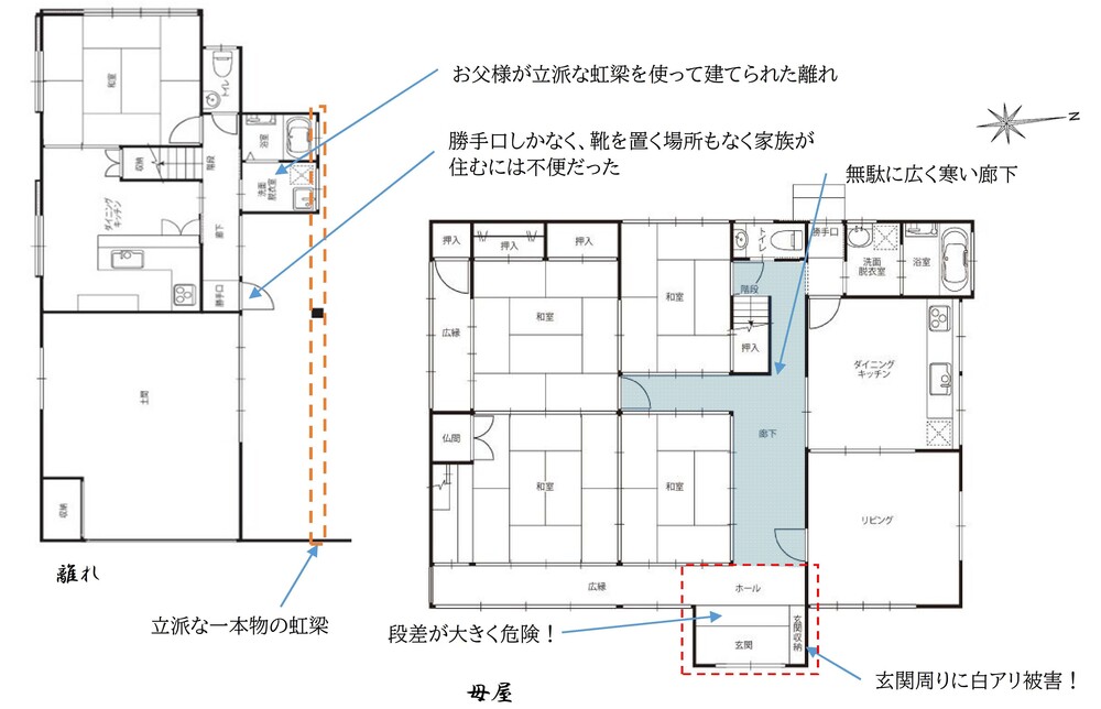 築50年の母屋と離れは、シロアリ被害や寒さ、段差、複雑な動線など多くの課題を抱えていた。父が建てたこの家を活かし、三世代が再び集う住まいへ再生する計画とした。既存の課題を整理し、次の4点を軸に改修を行った。