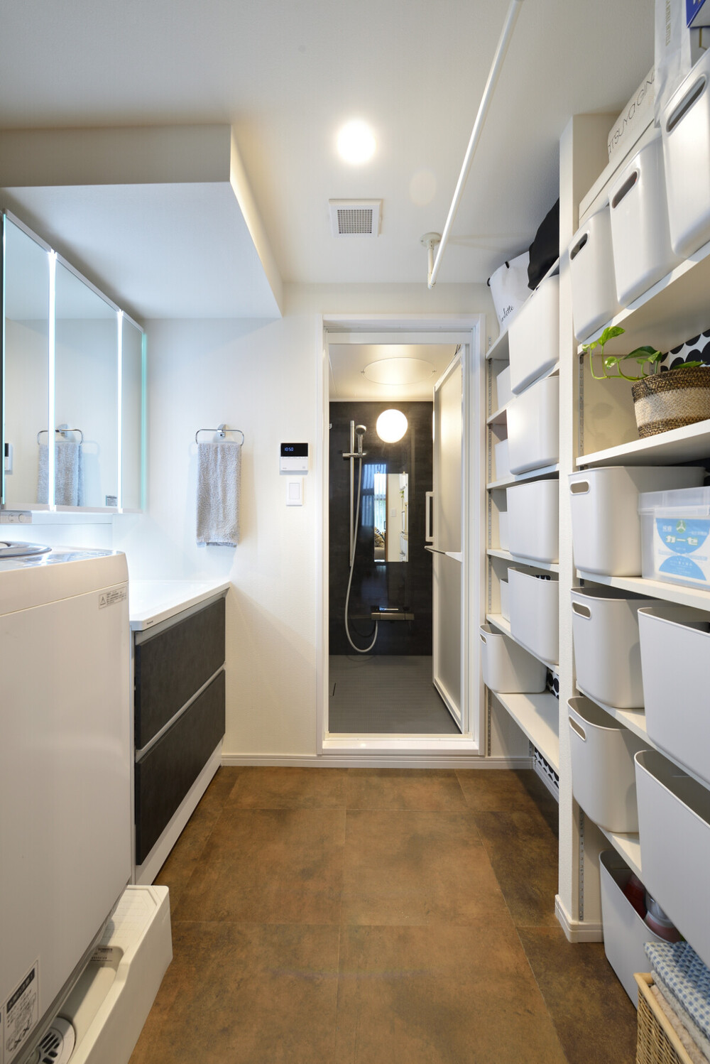 洗面室には、壁一面を最大限に活用したオープン棚を設置しました。生活用品をまとめて収納でき、どこに何があるか一目でわかる形にすることで、在庫管理もスムーズです。キッチンからもアクセスがしやすいため、家事の合間にさっと手に取れる実用性も兼ね備えています。
