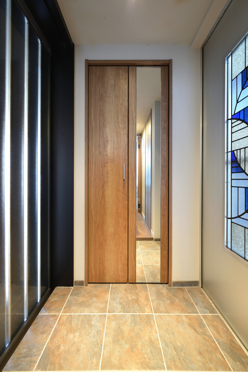 アウトセット引戸タイプの玄関ドアは、カームブラック系をセレクト。天然石調のニュアンスのある玄関タイルと、既存のステンドガラスの組合せにより、洗練されたイタリアンモダンテイストの玄関になりました。