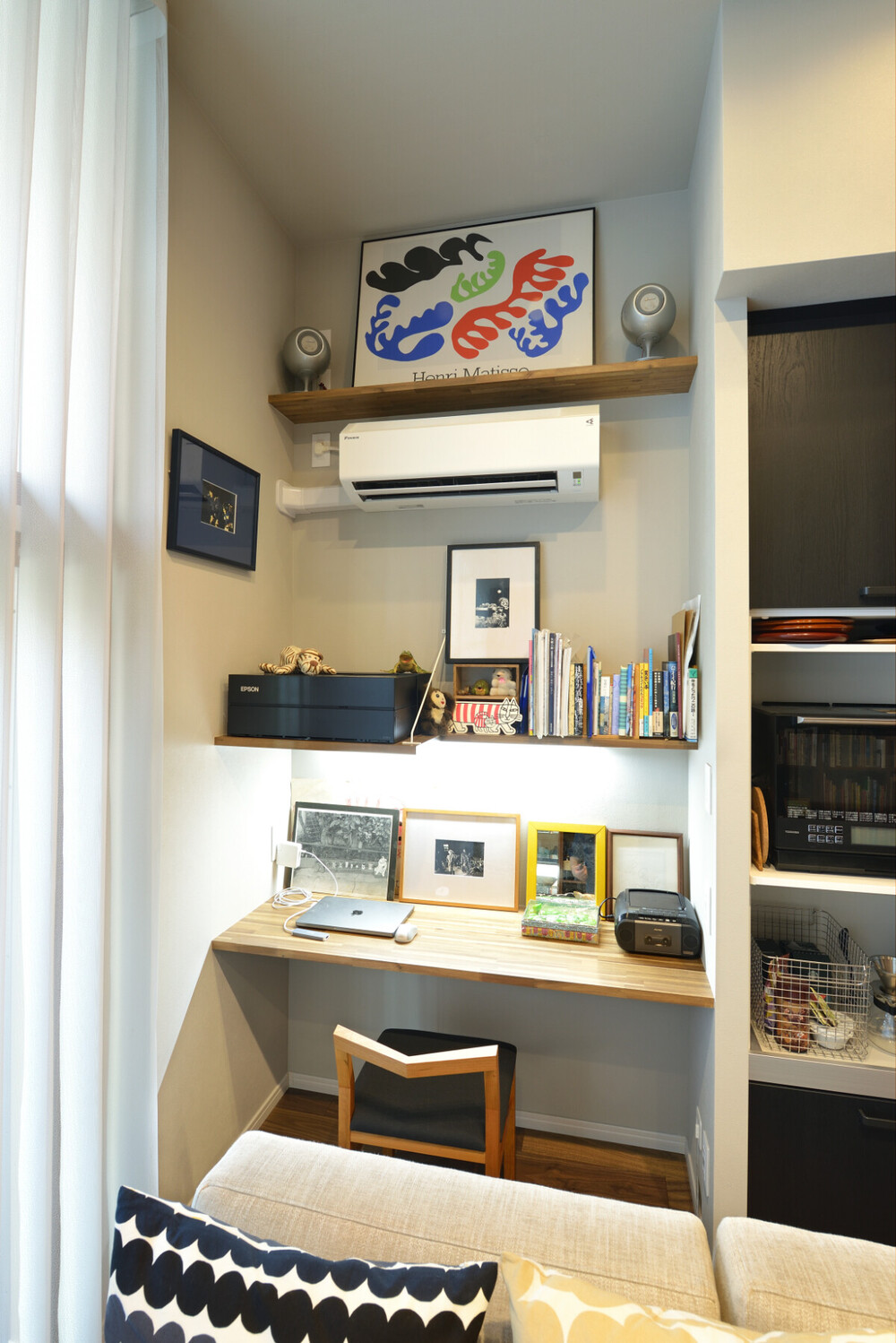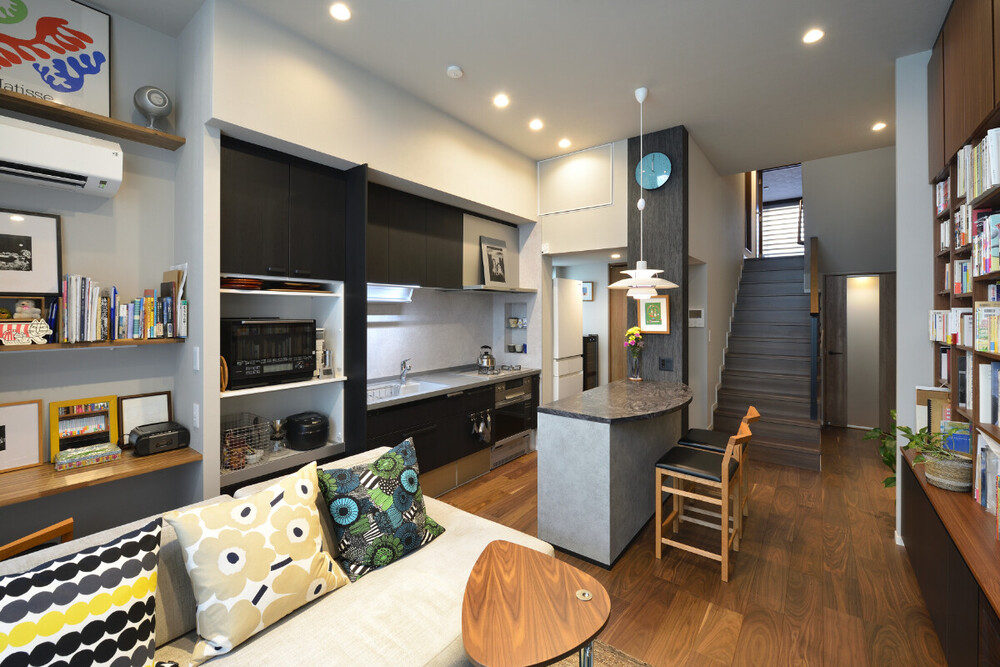 かつて収納場所だったスペースを、趣味の写真撮影の作業空間へと作り替えました。あえてキッチンとの間に「袖壁」を設けることで、適度なこもり感を演出。リビングの開放感はそのままに、作業に集中できる仕様となっています。