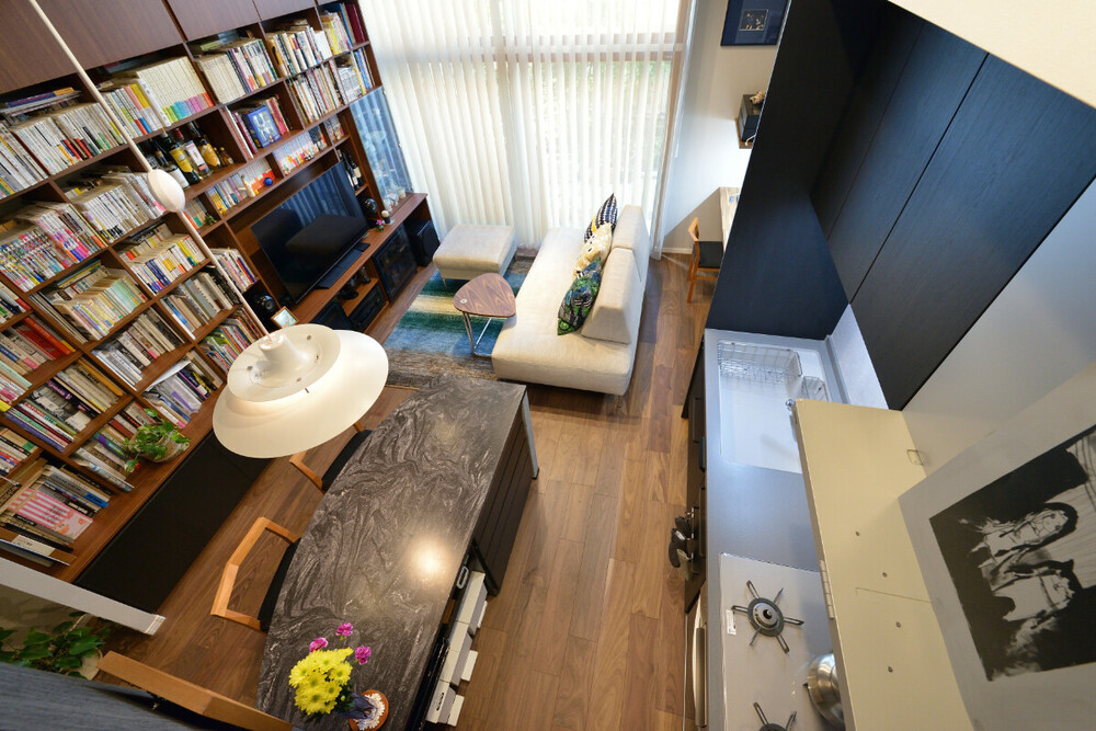 リビングに一歩足を踏み入れると目を引くのは、壁一面に設えた圧巻のオーダーメイド書棚。窓から差し込む柔らかな日差しの中で、お気に入りの一冊を手にソファで寛ぐ時間は、至福の時間とのこと。