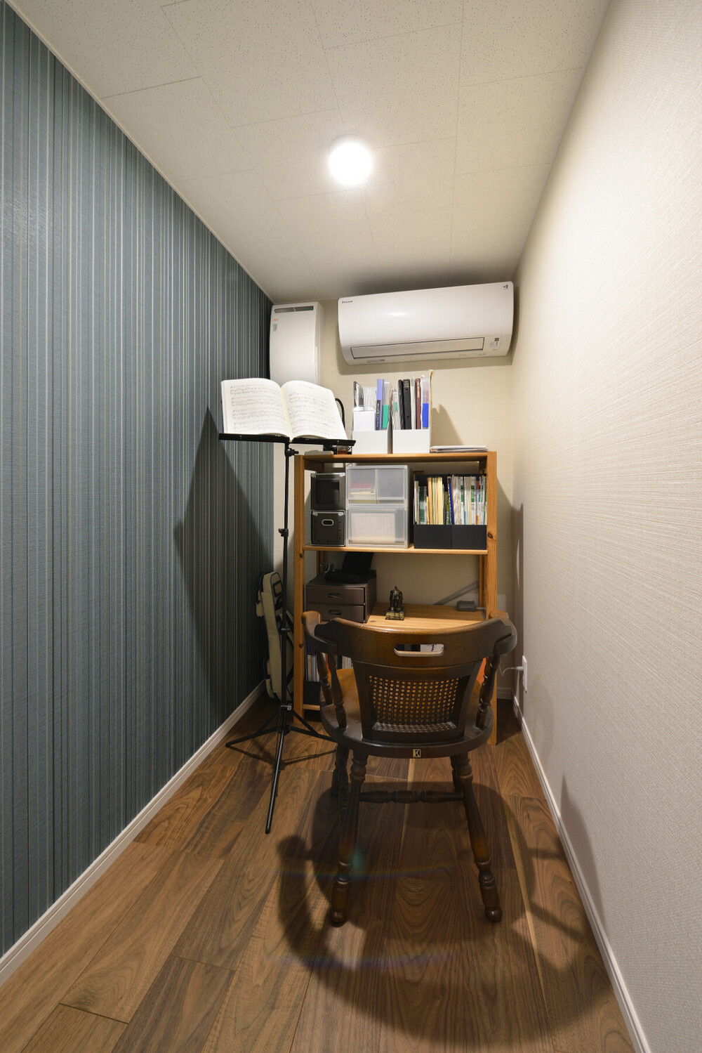 ご主人さまが40歳代で始めた合唱の練習スペースは、周囲に気兼ねなく練習ができるよう、防音ドア、吸音性能のある内装材を採用した防音仕様に仕上げました。