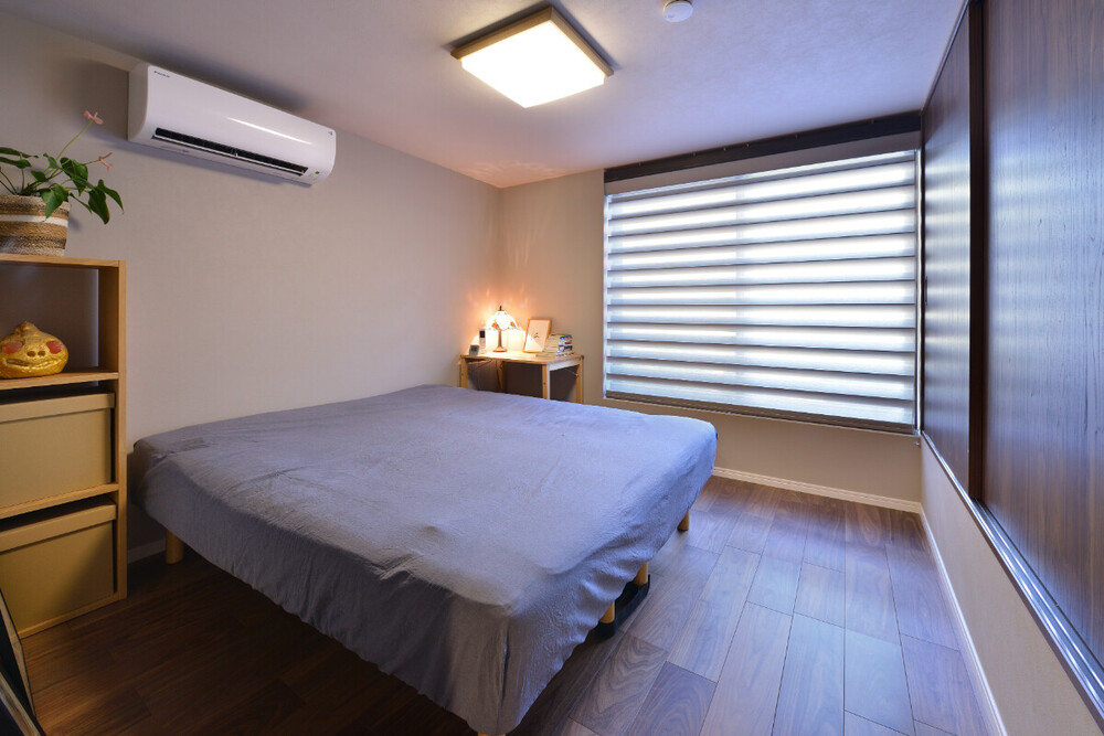 「ほどよい巣ごもり感」が心地よい洋室。防音ルームのスペースを確保するため以前よりコンパクトになったものの、主寝室としてはちょうど良いサイズ感に。右手の収納スペースは折戸から、開閉しやすい引戸に変えてより使いやすくなりました。