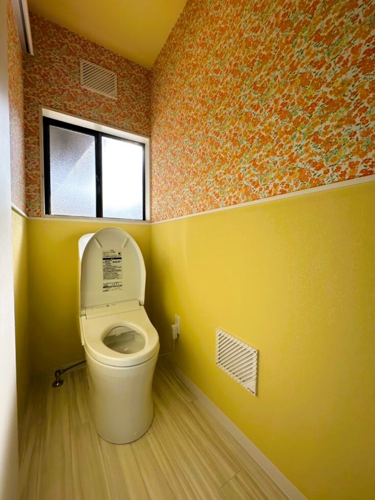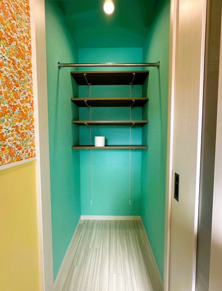 トイレ部分はポップに明るく、洗面台の部分は大人可愛く落ち着いたイメージに。