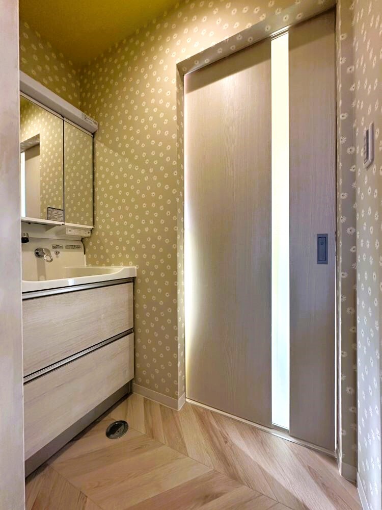 一見シンプルな洗面脱衣所には、蓄光タイプのクロスをセレクトしました。