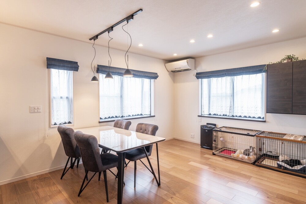 出窓からの光を存分に取り込めるよう、壁を取り払ったリビング・ダイニング。家族がくつろぐリビングは調光可能な照明を取り入れ、ゆったりとしたひとときを過ごせるように工夫しました。