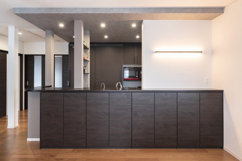 キッチンのリビング・ダイニング側のカウンター下部を棚にしたことでよりすっきりとした印象に。サイドの飾り棚は仕切りの役割を兼ねつつ、圧迫感がないよう天板の厚さにもこだわりました。